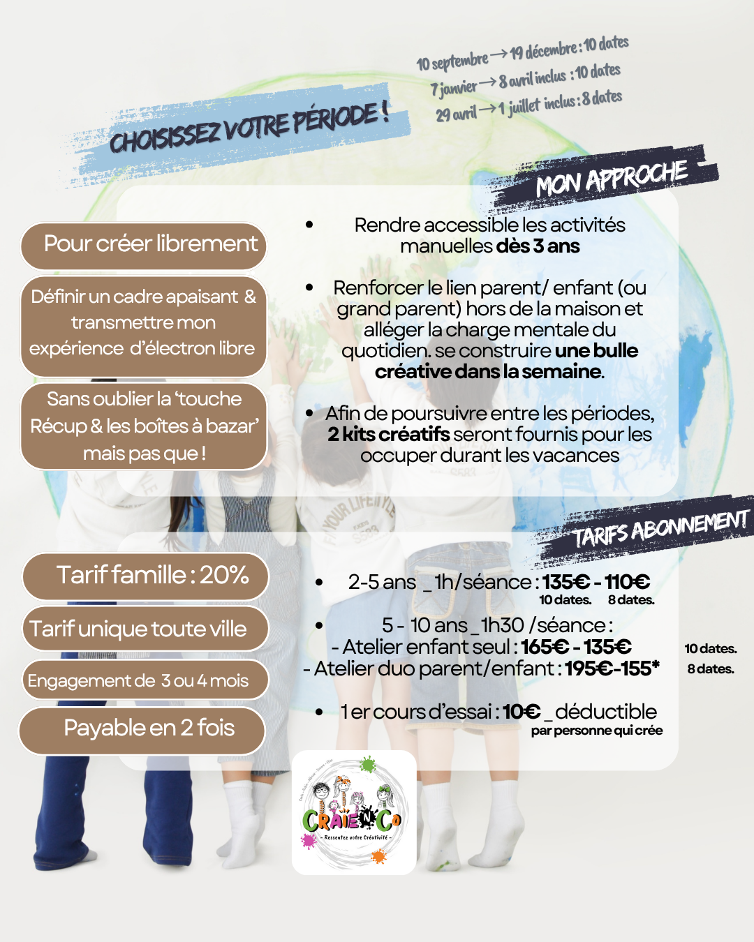 - Atelier duo parent/enfant : 195€ (/10)- 155 (/8)